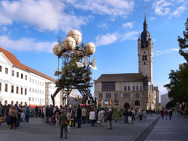Market Square and Town Hall of Dessau, Saxony-Anhalt, GermanySource: https://commons.wikimedia.org/wiki/File:Dessau,Farbfest_Gr%C3%BCn,Landung_der_Aeroflorale_II_auf_dem_Marktplatz.jpg